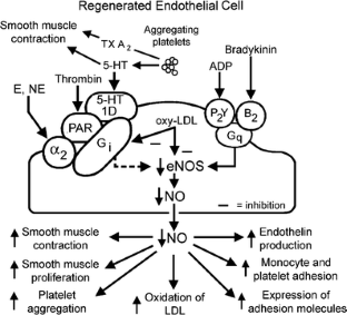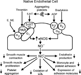 The endothelium can evoke relaxations (dilatations) of the underlying vascular smooth muscle, by releasing vasodilator substances. The best characterized endothelium-derived relaxing factor is nitric oxide (NO), which is synthesized by the endothelial isoform of nitric oxide synthase (eNOS). Endothelium-dependent relaxations involve both pertussis-toxin-sensitive Gi (e.g., responses to serotonin, sphingosine 1-phosphate, alpha2-adrenergic agonists, and thrombin) and pertussis-toxin-insensitive Gq (e.g., adenosine diphosphate and bradykinin) coupling proteins. eNOS undergoes a complex pattern of intracellular regulation, including post-translational modifications involving enzyme acylation and phosphorylation. eNOS is reversibly targeted to signal-transducing plasmalemmal caveolae where the enzyme interacts with a number of regulatory proteins, many of which are modified in cardiovascular disease states. The release of nitric oxide by the endothelial cell can be up- (e.g., by estrogens, exercise, and dietary factors) and down-regulated (e.g. oxidative stress, smoking, and oxidized low-density lipoproteins). It is reduced in the course of vascular disease (e.g., diabetes and hypertension). Arteries covered with regenerated endothelium (e.g. following angioplasty) selectively lose the pertussis-toxin-sensitive pathway for NO release which favors vasospasm, thrombosis, penetration of macrophages, cellular growth, and the inflammatory reaction leading to atherosclerosis. The unraveling of the complex interaction of the pathways regulating the presence and the activity of eNOS will enhance the understanding of the perturbations in endothelium-dependent signaling that are seen in cardiovascular disease states, and may lead to the identification of novel targets for therapeutic intervention.