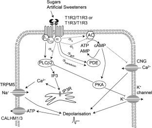 Yan W, Sunavala G, Rosenzweig S et al (2001) Bitter taste transduced by PLC-beta(2)-dependent rise in IP(3) and alpha-gustducin-dependent fall in cyclic nucleotides. Am J Phys Cell Phys 280:C742–C751. https://doi.org/10.1152/ajpcell.2001.280.4.C742