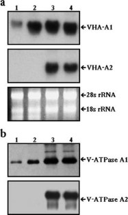 Hernando N, Bartkiewicz M, Collin-Osdoby P, Osdoby P, Baron R (1995) Alternative splicing generates a second isoform of the catalytic A subunit of the vacuolar H+-ATPase. Proc Natl Acad Sci USA 92:6087–6091