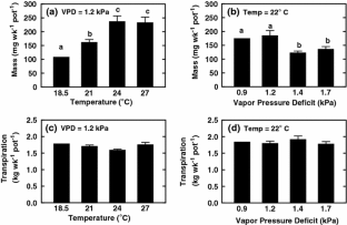 There is a lack of information on plant response to multifactor environmental variability including the interactive response to temperature and atmospheric humidity. These two factors are almost always confounded because saturated vapor pressure increases exponentially with temperature, and vapor pressure deficit (VPD) could have a large impact on plant growth. In this study using climate controlled mini-greenhouses, we examined the interacting influence of temperature and VPD on long-term growth of tall fescue (Festuca arundinacea Schreb), a cool season grass. From past studies it was expected that growth of tall fescue would decline with warmer temperatures over the range of 18.5–27°C, but growth actually increased markedly with increasing temperature when VPD was held constant. In contrast, growth declined in experiments where tall fescue was exposed to increasing VPD and temperature was held constant at 21°C. The inhibited growth appears to be in response to a maximum transpiration rate that can be supported by the tall fescue plants. The sensitivity to VPD indicates that if VPD remains stable in future climates as it has in the past, growth of tall fescue could well be stimulated rather than decreased by global warming in temperate climate zones.