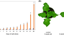 Quantum yields of PSII and PSI were simultaneously measured with a Dual PAM 100 fluorescence system (Heinz Walz GmbH, Effeltrich, Germany) with C3 performing control plants and CAM-induced plants (treated with salinity for 14–19 days). PSII photochemistry was investigated by means of chlorophyll a fluorescence on leaves adapted to darkness for 20 min. Quantum efficiency of PSII in the light adapted state, Y(II), and electron transport rate (ETR) were determined according to Genty et al. (1989), whereby leaf absorptivity was assumed to be 0.84. Non-photochemical quenching (NPQ) of PSII fluorescence was quantified according to Kramer et al. (2004). Quantum efficiency of PSI (Y(I)) was assessed via dual wavelength P700 measurements at 830 and 875 nm, respectively (Klughammer and Schreiber 1994). Oxidation was induced by actinic red light of an irradiance of 126 µmol m−2 s−1. In another experiment, induction kinetics of ETR was analyzed during 300 s irradiance with actinic light of an irradiance of 240 µmol m−2 s−1 using a fluorescence imaging system (Maxi PAM, Heinz Walz GmbH). Before illumination, the plants were kept in darkness for 15–20 min. Donor side limitation of PSI (YND) was calculated from reduced P700 (YND = 1 − P700 red). Acceptor side limitation of PSI (YNA) was determined as change in P700 signal upon application of far red light in addition to a saturating pulse (P m) as compared to a saturating pulse alone (P m′) (YNA = (P m − P m′)/P m).