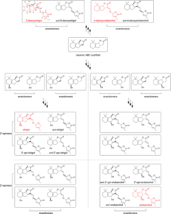 Strigolactones (SLs) typically comprise a tricyclic ABC ring system linked through an enol-ether bridge to a butenolide D-ring. The stereochemistry of the butenolide ring is conserved but two alternative configurations of the B–C ring junction leads to two families of SLs, exemplified by strigol and orobanchol. Further modifications lead to production of many different strigolactones within each family. The D-ring structure is established by a carotenoid cleavage dioxygenase producing a single stereoisomer of carlactone, the likely precursor of all SLs. Subsequent oxidation involves cytochrome P450 enzymes of the MAX1 family. In rice, MAX1 enzymes act stereospecifically to produce 4-deoxyorobanchol and orobanchol. Strigol- and orobanchol-type SLs have different activities in the control of seed germination and shoot branching, depending on plant species. This can partly be explained by different stereospecificity of SL receptors which includes the KAI2/HTL protein family in parasitic plants and the D14 protein functioning in shoot development. Many studies use chemically synthesised SL analogues such as GR24 which is prepared as a racemic mixture of two stereoisomers, one with the same stereo-configuration as strigol, and the other its enantiomer, which does not correspond to any known SL. In Arabidopsis, these two stereoisomers are preferentially perceived by AtD14 and KAI2, respectively, which activate different developmental pathways. Thus caution should be exercised in the use of SL racemic mixtures, while conversely the use of specific stereoisomers can provide powerful tools and yield critical information about receptors and signalling pathways in operation.