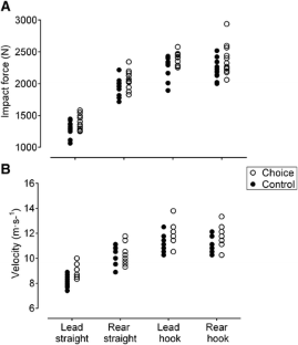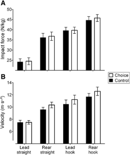 While self-controlled practice has been shown to enhance motor learning with various populations and novel tasks, it remains unclear if such effects would be found with athletes completing familiar tasks. Study 1 used a single case-study design with a world-champion kickboxer. We investigated whether giving the athlete a choice over the order of punches would affect punching velocity and impact force. Separated by 1 min of rest, the athlete completed 2 rounds of 12 single, maximal effort punches (lead straight, rear straight, lead hook and rear hook) delivered to a punching integrator in a counterbalanced order over six testing days. In one round the punches were delivered in a predetermined order while in the second round the order was self-selected by the athlete. In the choice condition, the world champion punched with greater velocities (6–11 %) and impact forces (5–10 %). In Study 2, the same testing procedures were repeated with 13 amateur male kickboxers over 2 testing days. Similar to Study 1, the athletes punched with significantly greater velocities (6 %, p < 0.05) and normalised impact forces (2 %, p < 0.05) in the choice condition. These findings complement research on autonomy support in motor learning by demonstrating immediate advantages in force production and velocity with experienced athletes.