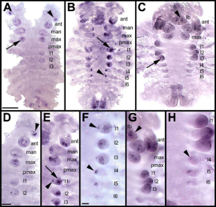 Prpic NM, Tautz D (2003) The expression of the proximodistal axis patterning genes Distal-less and dachshund in the appendages of Glomeris marginata (Myriapoda: Diplopoda) suggests a special role of these genes in patterning the head appendages. Dev Biol 260:97–112