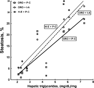 The issue of adequately quantitatively evaluating hepatic steatosis is still unresolved. Therefore, we compared three methods of quantitative assessment. Two groups of mice (n = 10 each) were fed standard chow (10% fat, SC group) or a high-fat diet (60% fat, HF group) for 16 weeks, and hepatic triglyceride (HT) and liver tissue were then studied. Paraplast-embedded tissues stained by hematoxylin and eosin (H-E) were compared to frozen sections stained by Oil Red-O (ORO). In addition, the volume density of steatosis (Vv[steatosis, liver]) was measured by point counting (P-C, sections H-E or ORO) or by image analysis (I-A, sections ORO). HT was significantly higher in the HF group (104% greater, P = 0.0004) than in the SC group. With P-C and H-E, Vv[steatosis, liver] was 4.80 ± 0.90% in the SC group and 33.50 ± 3.17% in the HF group (600% greater, P < 0.0001). With P-C and ORO, Vv[steatosis, liver] was 4.86 ± 0.89% in the SC group and 25.21 ± 1.27% in the HF group (420% greater, P < 0.0001). With I-A and ORO, Vv[steatosis, liver] was 4.17 ± 0.85% in the SC group and 23.35 ± 1.58% in the HF group (460% greater, P < 0.0001). Correlations between Vv[steatosis, liver] and HT were strong and significant in all methods. In conclusion, all methods were appropriate and reproducible. In P-C and H-E, there is a slight overestimation of steatosis in the HF animals in comparison to frozen sections and ORO; in frozen sections, differences between P-C and I-A are insignificant.