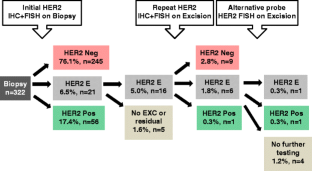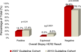 Muller KE, Marotti JD, Memoli VA, et al. (2015) Impact of the 2013 ASCO/CAP HER2 guideline updates at an academic medical center that performs primary HER2 FISH testing: increase in equivocal results and utility of reflex immunohistochemistry. Am J Clin Pathol 144(2):247–252