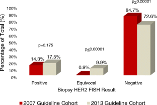 Long TH, Lawce H, Durum C, et al (2015) The new equivocal: changes to HER2 FISH results when applying the 2013 ASCO/CAP Guidelines. Am J Clin Pathol 144(2):253:262