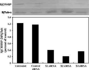 The calcium-regulated heat-stable protein of 24 kDa (CRHSP-24) is a major calcineurin phosphoprotein that functions in multiple signal transduction pathways in cell metabolism. Schistosomes are multicellular parasites that infect 200 million people worldwide, even though treatment has been available for two decades. To determine the function of schistosome CRHSP-24 (SjCRHSP-24), we successfully knocked down SjCRHSP-24 in Schistosoma japonicum by RNA interference (RNAi). By establishing controls for measuring off-target RNAi effects, we found that different double-stranded (dsRNA) sequences had different levels of effectiveness. While all tested dsRNAs reduced CRHSP-24 transcript levels, the S2 dsRNA consistently reduced CRHSP-24 expression to >95% of the control. Knockdown of the SjCRHSP-24 gene significantly affected the morphology and vitality of S. japonicum.