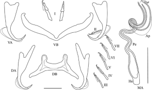 Pariselle A, Euzet L (1995) Gill parasites of the genus Cichlidogyrus Paperna, 1960 (Monogenea, Ancyrocephalidae) from Tilapia guineensis (Bleeker, 1862), with descriptions of six new species. Syst Parasitol 30:187–198