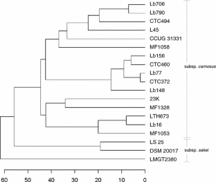 Klein G, Dicks LMT, Pack A, Hack B, Zimmerman K, Dellaglio F, Reuter G (1996) Emended description of Lactobacillus sake (Katahiri, Katahara and Fukami) and Lactobacillus curvatus (Abo-Elnega Kandler): Numerical classification revealed by protein fingerprinting and identification based on biochemical patterns and DNA–DNA hybridizations. Int J Syst Bacteriol 46:367–376