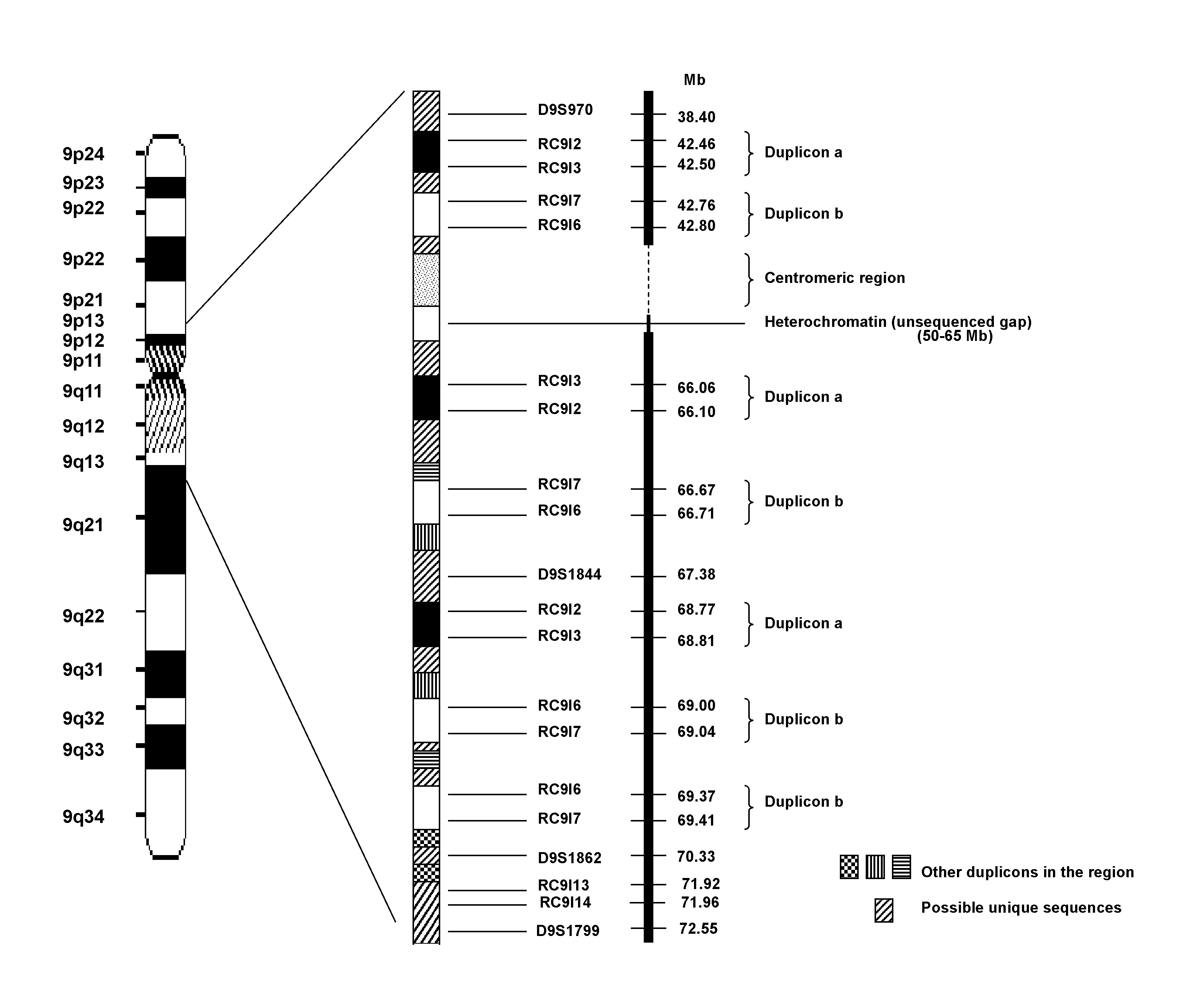 Supplementary fig. 2 Segmental duplications in the 9p13.1-9q21.11 region. The positions of the markers are given in Mb on the physical map (NCBI, Build 36 version 2). We identified duplicons a and b. The other duplicons shown in the figure are based on the findings of Paulis et al. (2004). (GIF 86 kb)