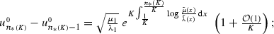 \(\Delta _{n_*{\scriptscriptstyle (K)}}^{\!{\scriptscriptstyle 0}}-\Delta _{n_*{\scriptscriptstyle (K)}-1}^{\!{\scriptscriptstyle 0}} = -\frac{\sqrt{2\pi }}{2x_* \tilde{\lambda }(x_*)\sqrt{K H''(x_*)}} \left( 1+\frac{(\log K)^3}{\sqrt{K}}\right) ;\)