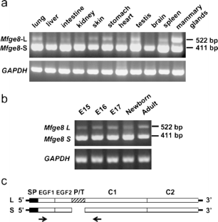 Oshima K, Aoki N, Negi M, Kishi M, Kitajima K, Matsuda T (1999) Lactation-dependent expression of an mRNA splice variant with an exon for a multiply O-glycosylated domain of mouse milk fat globule glycoprotein MFG-E8. Biochem Biophys Res Commun 254:522–528