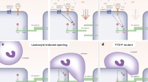 L-selectin shedding can be activated during rolling and TEM under flow conditions (Lee et al. 2007; Rzeniewicz et al. 2015). For example, in parallel plate flow chamber studies, primary human neutrophils engaged in prolonged rolling activity on immobilised sLex can over time re-enter flow. Labelling of primary human neutrophils with fluorescently conjugated anti-L-selectin antibody enabled visualisation of cleaved L-selectin, deposited as fluorescent tracks along rolling contact sites. Furthermore, sustained release of L-selectin led to faster rolling speeds that eventually culminated in detachment of the neutrophil back into flow. The term “mechanical shedding of L-selectin” was coined to explain this phenomenon, which could be blocked specifically with synthetic inhibitors of p38 MAPK, implying that intracellular signalling is underpinning the mechanism (Lee et al. 2007). Although this observation stems from in vitro studies, it has yet to be described and characterised in vivo (see “The importance of mechanosignalling in circulating neutrophils”). Earlier studies showed, under “static” conditions (i.e., in the absence of haemodynamic shear stress), a direct correlation between neutrophil TEM and L-selectin expression. Transmigrated neutrophils harvested from beneath activated endothelial monolayers registered L-selectin-negative by flow cytometry, suggesting that L-selectin shedding occurred during recruitment and/or during TEM (Allport et al. 1997). Integrating fluorescence timelapse microscopy with the parallel plate flow chamber has exposed exactly where and when L-selectin shedding occurs in transmigrating leukocytes (Rzeniewicz et al. 2015) (see “L-selectin: a driver of invasion and cell polarity”).