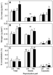 Stimulation of vegetative growth by an elevated CO2 concentration does not always lead to an increase in reproductive yield. This is because reproductive yield is determined by the fraction of biomass allocated to the reproductive part as well as biomass production. We grew Xanthium canadense at low N (LN) and high N levels (HN) under an ambient (360 μmol mol-1) and elevated (700 μmol mol-1) CO2 concentration ([CO2]) in open-top chambers. Reproductive yield was analysed as the product of: (1) the duration of the reproductive period, (2) the rate of dry mass acquisition in the reproductive period, and (3) the fraction of acquired biomass allocated to the reproductive part. Elevated [CO2] increased the total amount of biomass that was allocated to reproductive structures, but this increase was caused by increased capsule mass without a significant increase in seed production. The increase in total reproductive mass was due mainly to an increase in the rate of dry mass acquisition in the reproductive period with a delay in leaf senescence. This positive effect was partly offset by a reduction in biomass allocation to the reproductive part at elevated [CO2] and HN. The duration of the reproductive period was not affected by elevated [CO2] but increased by HN. Seed production was strongly constrained by the availability of N for seed growth. The seed [N] was very high in X. canadense and did not decrease significantly at elevated [CO2]. HN increased seed [N] without a significant increase in seed biomass production. Limited seed growth caused a reduction in biomass allocation to the reproductive part even though dry mass production was increased due to increased [CO2] and N availability.