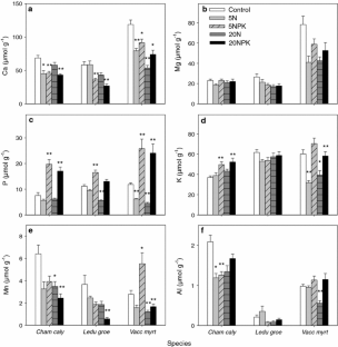 Plants in nutrient-poor environments typically have low foliar nitrogen (N) concentrations, long-lived tissues with leaf traits designed to use nutrients efficiently, and low rates of photosynthesis. We postulated that increasing N availability due to atmospheric deposition would increase photosynthetic capacity, foliar N, and specific leaf area (SLA) of bog shrubs. We measured photosynthesis, foliar chemistry and leaf morphology in three ericaceous shrubs (Vaccinium myrtilloides, Ledum groenlandicum and Chamaedaphne calyculata) in a long-term fertilization experiment at Mer Bleue bog, Ontario, Canada, with a background deposition of 0.8 g N m−2 a−1. While biomass and chlorophyll concentrations increased in the highest nutrient treatment for C. calyculata, we found no change in the rates of light-saturated photosynthesis (A max), carboxylation (V cmax), or SLA with nutrient (N with and without PK) addition, with the exception of a weak positive correlation between foliar N and A max for C. calyculata, and higher V cmax in L. groenlandicum with low nutrient addition. We found negative correlations between photosynthetic N use efficiency (PNUE) and foliar N, accompanied by a species-specific increase in one or more amino acids, which may be a sign of excess N availability and/or a mechanism to reduce ammonium (NH4) toxicity. We also observed a decrease in foliar soluble Ca and Mg concentrations, essential minerals for plant growth, but no change in polyamines, indicators of physiological stress under conditions of high N accumulation. These results suggest that plants adapted to low-nutrient environments do not shift their resource allocation to photosynthetic processes, even after reaching N sufficiency, but instead store the excess N in organic compounds for future use. In the long term, bog species may not be able to take advantage of elevated nutrients, resulting in them being replaced by species that are better adapted to a higher nutrient environment.