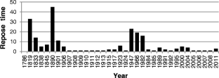 The forecast presented here was made prior to and validated by the eruption of 3 July 2011. We anticipate that it will remain valid for the next 5–10 years, although it should be re-evaluated with each eruption, as changes in the morphology of the volcano may affect the forecast.