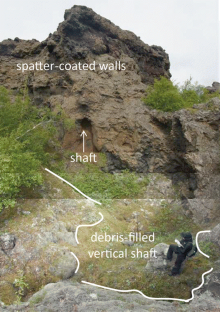 The origin of Dimmuborgir, a shield-like volcanic structure within the Younger Laxá lava flow field near Lake Mývatn, in northern Iceland, has long been questioned. New airborne laser mapping (light detection and ranging (LiDAR)), combined with ground-penetrating radar results and a detailed field study, suggests that Dimmuborgir is a complex of at least two overlapping rootless shields fed by lava erupting from the nearby Lúdentarborgir crater row. This model builds upon previous explanations for the formation of Dimmuborgir and is consistent with observations of rootless shield development at Kīlauea Volcano, Hawaii. The larger rootless shields at Dimmuborgir, 1–1.5 km in diameter, elliptical in plan view, ∼30 m in height, and each with a 500-m-wide summit depression, were capable of storing as much as 2–3 × 106 m3 of lava. They were fed by lava which descended 30–60 m in lava tubes along a distance of 3 km from the crater row. The height difference generated pressure sufficient to build rootless shields at Dimmuborgir in a timescale of weeks. The main summit depressions, inferred to be drained lava ponds, could have emptied via a 30-m-wide × 5-m-deep channel, with estimated effusion rates of 0.7–7 m3 s−1 and minimum flow durations of 5–50 days. We argue that the pillars for which Dimmuborgir is famed are remnants of lava pond rims, at various stages of disintegration that formed during pond drainage.