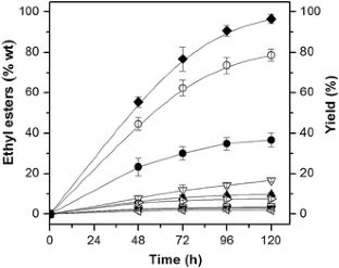 The intracellular lipase production by Mucor circinelloides URM 4182 was investigated through a step-by-step strategy to attain immobilized whole-cells with high lipase activity. Physicochemical parameters, such as carbon and nitrogen sources, inoculum size and aeration, were studied to determine the optimum conditions for both lipase production and immobilization in polyurethane support. Olive oil and soybean peptone were found to be the best carbon and nitrogen sources, respectively, to enhance the intracellular lipase activity. Low inoculum level and poor aeration rate also provided suitable conditions to attain high lipase activity (64.8 ± 0.8 U g−1). The transesterification activity of the immobilized whole- cells was assayed and optimal reaction conditions for the ethanolysis of babassu oil were determined by experimental design. Statistical analysis showed that M. circinelloides whole-cells were able to produce ethyl esters at all tested conditions, with the highest yield attained (98.1 %) at 35 °C using an 1:6 oil-to-ethanol molar ratio. The biocatalyst operational stability was also assayed in a continuous packed bed reactor (PBR) charged with glutaraldehyde (GA) and Aliquat-treated cells revealing half-life of 43.0 ± 0.5 and 20.0 ± 0.8 days, respectively. These results indicate the potential of immobilized M. circinelloides URM 4182 whole-cells as a low-cost alternative to conventional biocatalysts in the production of ethyl esters from babassu oil.