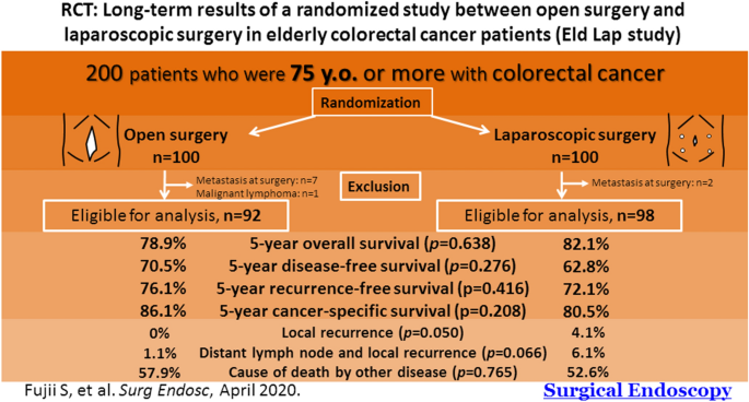 Ishibe A, Ota M, Fujii S, Suwa Y, Suzuki S, Suwa H, Momiyama M, Watanabe J, Watanabe K, Taguri M, Kunisaki C, Endo I (2017) Midterm follow-up of a randomized trial of open surgery versus laparoscopic surgery in elderly patients with colorectal cancer. Surg Endosc 31:3890–3897