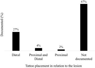 Of the 1062 patients identified, laparoscopic resection occurred in 59% of patients. 57% of patients underwent tattooing for tumour localization at index endoscopy. Tattoos were placed distal (27%), both proximal and distal (4%), and just proximal (2%) to the lesion. However, in the majority of cases the tattoo location was not documented (67%). On multivariate analysis, patients who had lesions located in the transverse colon (OR: 1.93, 95% CI 1.04–3.59), had surgery performed after 2010 (2011–2014: OR: 1.88, 95% CI 1.31–2.68; 2015–2017: OR: 2.87, 95% CI 1.93–4.26), underwent laparoscopic resections (OR: 1.69, 95% CI 1.22–2.33), and had their index endoscopy performed in an urban setting (OR: 5.92, 95% CI 3.23–10.87), were at higher odds of having a tattoo placed at index endoscopy.
