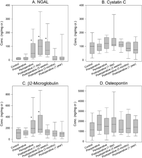 Koyner JL, Vaidya VS, Bennett MR, Ma Q, Worcester E, Akhter SA, Raman J, Jeevanandam V, O'Connor MF, Devarajan P, Bonventre JV, Murray PT (2010) Urinary biomarkers in the clinical prognosis and early detection of acute kidney injury. Clin J Am Soc Nephrol 5:2154–2165
