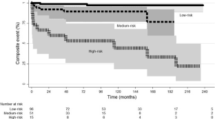 Among 162 children with SFK included in the analysis, 132 (81.5%) presented multicystic dysplastic kidney, 20 (12.3%) renal hypodysplasia, and 10 (6.2%) unilateral renal agenesis. Of 162 patients included in the analysis, 10 (6.2%) presented persistent proteinuria, 11 (6.8%) had hypertension, 9 (5.6%) developed CKD stage ≥ 3, and 18 (11%) developed the composite outcome. After adjustment by the Cox model, three variables remained as independent predictors of the composite event: creatinine (HR, 3.93; P < 0.001), recurrent urinary tract infection (UTI) (HR, 5.05; P = 0.002), and contralateral renal length at admission (HR, 0.974; P = 0.002). The probability of the composite event at 10 years of age was estimated as 3%, 11%, and 56% for patients assigned to the low-risk, medium-risk, and high-risk groups, respectively (P < 0.001).