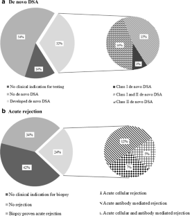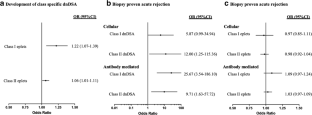 The cohort comprised 59 children (aged 0–18 years) who received their first kidney allograft and were followed for median (interquartile range) 4.5 (± 2.6) years. Overall, 32% (19/59) developed dnDSA (class I 3% (2/59), class II 14% (8/59), 15% class I and II (9/59)), and 24% (14/59) developed biopsy-proven acute rejection. Every unit increase in class I and II eplet mismatches corresponded to an increase in risk of class I (odds ratio (OR) 1.22, 95% CI 1.07–1.39, p < 0.01) and class II (OR 1.06, 95% CI 1.01–1.11, p = 0.02) dnDSA development. Compared with recipients without dnDSA, class I and II dnDSA were associated with direction of effect towards increased risk of acute cellular rejection (class I: OR 5.87, 95% CI 0.99–34.94, p = 0.05; class II: OR 12.00, 95% CI 1.25–115.36, p = 0.03) and acute antibody-mediated rejection (class I: OR 25.67, 95% CI 3.54–186.10, p < 0.01; class II: OR 9.71, 95% CI 1.64–57.72, p = 0.01).
