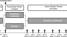 The study enrolled subjects with CKD and hyperphosphatemia defined according to age-specific criteria, as detailed in Fig. 1. Eligible subjects were either PB-naïve or had been receiving stable doses of a maximum of two PBs for at least 1 month prior to screening. Subjects receiving prior PB therapy with serum phosphorus below the age-specific target were required to undergo a washout period before randomization. Subjects already receiving a PB whose serum phosphorus levels met age-specific target levels were eligible for randomization without a washout; prior PBs were discontinued. All subjects were required to have CKD and subjects ≥ 1 year old were required to have stage 4 or 5 CKD defined by an estimated glomerular filtration rate (eGFR) < 30 mL/min/1.73 m2 [26], or stage 5D CKD on at least 2 months of adequate maintenance hemodialysis (HD) or peritoneal dialysis (PD) before screening. As far as possible, dialysis regimens were not changed during the study. Concomitant medications that may influence serum phosphorus (e.g., vitamin D, vitamin D analogues and calcimimetics), were, per protocol, not changed as far as possible during the study. Counseling regarding dietary phosphorus per local practice was encouraged.
