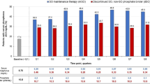 In the overall FAS, the reduction in serum phosphorus from baseline to the end of stage 1 in the SFOH group, analyzed with the pre-defined statistical model, was not statistically significant (p = 0.146): least squares (LS) mean ± standard error (SE) of − 0.371 ± 0.251 mg/dL (95% CI 0.874, 0.132) (Table 2). Similar results were observed from the sensitivity analysis without imputation of missing central laboratory values (data not shown), and analysis of the PPS population (Table 2). However, a post hoc analysis, accounting for imbalance in the age group covariate, showed a statistically significant reduction in serum phosphorus from baseline to the end of stage 1 in the overall FAS: LS mean ± SE of − 0.488 ± 0.186 mg/dL (95% CI − 0.861, − 0.116; p = 0.011), as well as in the PPS: LS mean ± SE of − 0.552 ± 0.270 mg/dL (95% CI − 1.098, − 0.005; p = 0.048) (Table 2).