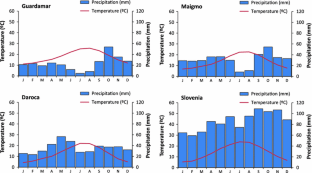 Tree-ring widths (RW), earlywood (EW) and latewood (LW) widths, the transition from early to latewood (T) and the occurrence of intra-annual density fluctuations in EW (E-ring) and in LW (L-ring), as well as the presence of resin canals in EW and LW, were analyzed in Aleppo pine (Pinus halepensis Mill.) from three sites in Spain and one in Slovenia to find out if the anatomical characteristics can provide additional seasonal climate–growth information from contrasted environmental conditions. Principal component analysis was applied to elucidate the relationship between the measured parameters and climate. Principal component factor PC1 proved to be related to parameters of EW and the climatic variables of winter-spring; PC2 to parameters of LW and climatic variables of summer–autumn; PC3 to conditions during transitions from humid to dry periods. The three PCs vary between sites and are determined by the climatic conditions during their formation. The study demonstrates that wood anatomical features may provide complementary information to that contained in tree-ring widths. Since such results are obtained on contrasting sites, it is likely that it may be generalized over the wide range of P. halepensis distribution representing a useful proxy for studies on a regional scale.