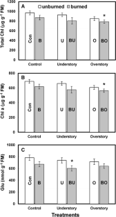 A full factorial design crossing overstory (O) and understory (U) thinning and prescribed burning (B) was started at Teakettle Experimental Forest, California, in 2001 with the aim of achieving shifts in species composition to favor fire-resistant pines over fir. The goal of the present study was to evaluate the use of metabolic changes as early indicators for predicting the effects of these treatments on species-specific growth and long-term productivity of Pinus jeffreyi, Pinus lambertiana, and Abies concolor. Foliar polyamines, amino acids, soluble proteins and chlorophyll were quantified and related with foliar and soil chemistry. Most changes in soil chemistry occurred only with combined treatments (BU or BO). Changes in foliar metabolism were not driven by soil chemistry. In general, the pines were more sensitive to water stress as compared to fir as indicated by proline content. Understory thinning had no effect on any species. Both O and BO had species-specific effects on foliar amino acids, chlorophyll, soluble proteins, and inorganic ions. In addition, both O and BO were the most extreme thinning treatments for pines as they greatly increase the time needed to replenish carbon stocks. With the exception of some amino acids, B by itself had no major effects on foliar inorganic ions, chlorophyll content, and polyamines for any of the three species while BU caused a decrease in chlorophyll in white fir, suggesting a decline in photosynthetic capacity. These data point to BU as the best management option to specifically decrease the growth of fire-sensitive white fir without a major impact on pines.