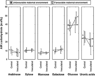The expression of disease is increasingly recognised as being influenced by maternal effects, given that environmental conditions experienced by mother trees affect tolerance in offspring. It is hypothesised that plant carbohydrates could mediate transgenerational tree-pathogen interactions. The carbohydrate content of Pinus pinaster seedlings obtained from two contrasting maternal environments was studied and seedlings from the two environments were challenged with Fusarium circinatum. The representative mid-infrared spectra of samples in the range of the carbohydrates diagnosed higher proportion of methylesterified pectic polysaccharides and lower proportion of nonesterified pectic polysaccharides for inoculated than for control seedlings. Total carbohydrate content of seedlings from the unfavourable environment did not differ much from total carbohydrate content of seedlings from the favourable maternal environment. However, glucose was 13 % higher and uronic acids 11 % lower in seedlings from the favourable environment after inoculation in comparison to seedlings from the unfavourable maternal environment which had their carbohydrate contents unaltered after inoculation. It is concluded that plant carbohydrates mediate transgenerational tree-pathogen interactions.