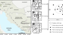 Statistical analysis of the seedling biometric data (height, diameter and dry weight) was performed with the parametric t test and nonparametric Mann–Whitney U test using Statistica 10.0 (StatSoft 2011) at the level of significance α = 0.05. The nonparametric test was used when Shapiro–Wilk normality and Levene’s homogeneity of variance were not found. To assess if a sufficient number of samples were collected, the observed species accumulation curve and jackknife first-degree estimator curve with 100 randomization with sample replacement were plotted in the Estimates 9.1.0 software (Colwell 2006). Communities of ECM fungi were described by species richness (number of identified mycorrhizal taxa), relative abundance (number of mycorrhizas of a given mycorrhizal species per total number of mycorrhizas in each site), and frequency (ratio of number of seedlings with given ECM taxa to total number of seedlings in each stand). The ECM species diversity was evaluated by Shannon–Wiener’s (H ′) and Simpson’s (1D) indicators. The variability of ECM composition among seedlings of different forest stands was visualized using non-metric multidimensional scaling (NMDS). Analysis of similarity ANOSIM was used to determine if relative abundance of ECM symbionts differed between study sites. The above coefficients, ANOSIM, NMDS, and the cluster analysis were calculated in PAST 2.17 software (Hammer et al. 2001) based on standardized, square root transformed data of each taxa. The Bray–Curtis dissimilarity coefficient was chosen for calculation in analyses (Bray and Curtis 1957).