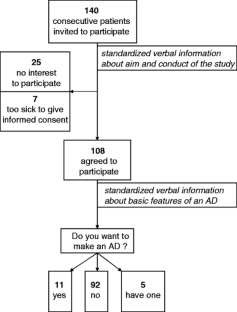All patients were informed about the basic features of AD in a standardized manner by a single independent physician. One hundred and eight (39 women, 69 men; mean age 56.6 ± 14.9 years) of 140 invited patients completed the study.