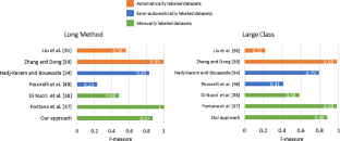 Tables 9 and 10 present the metric-based heuristic’s performance on the Large Class and Long Method detection task, respectively. For easy comparison of the heuristic-based detectors on the test set, we summarize the performances from Tables 9 and 10 in Figs. 6 and 7, respectively.