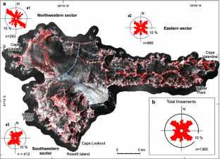 Elephant Island, located in the vicinity of the present-day active boundary of the South Shetland Block and the Antarctic and Scotia plates, is a region of particular interest for understanding the past and present geodynamic evolution of the southern Scotia Arc. Lineament from different data sources, field-measured fractures and geomorphological evidences have been analysed in this context. The lineaments extracted from aerial photographs (1,624), from a DEM (348) and from RADARSAT-2 satellite data (1,365) indicate four dominant lineament sets with NE–SW, NW–SE, N–S and W–E strikes. All data sources identified similar lineament families, but differences in the frequency distributions and subsequently on the dominant orientations were observed. The measurements direct of fractures were obtained from 23 sites in the field at which 278 planes were measured. Fracture planes indicate main modes trending in the NNE–SSW and NNW–SSE directions and a secondary mode in the E–W. The major trends of the fracture measurements and the lineaments display a good correlation in the E–W direction. However, there is an angular variation in the azimuth values of the NNE–SSE and NNW–SSE fractures with respect to the N–S, NE–SW and NW–SE orientations of the lineaments of approximately 20°. This trend deviation may be due to the fact that mapped lineaments are composed of small fracture sets that may be related to shear fractures that cannot be distinguished at the aerial photograph or radar satellite data scales. Submerged sea-floor morphological feature orientations match the studied morphostructures on the island and the main tectonic structures in this part of the Scotia Arc. A linkage of the main lineament families to the tectonic stages from the Oligocene to the present has been proposed, taking into account the information of the orientation and sense of movement of the fractures and stresses in the Elephant Island region.