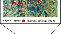 The ionic ratio can be used to indicate the occurrence of certain processes relevant to water quality and can help identify the source of water (Jebreen et al. 2018). The Na:Cl ratio is usually used to identify halite dissolution or saline intrusion (Srinivasamoorthy et al. 2011). Some ionic ratios for the samples are shown in Fig. 6. The sodium and chloride concentrations were linearly related (Fig. 6a). Sodium and hydrogen carbonate were generally dominant, which is a characteristic of water affected by water–rock interactions. The hydrogen carbonate concentrations were higher than the sodium concentrations (Fig. 6b), suggesting that silicate weathering was one of the dominant reactions affecting the spring water. The plots of the Na+ + K+ concentrations against the SO42− concentrations (Fig. 6c) and the Ca2+ + Mg2+ concentrations against the SO42− concentrations (Fig. 6d) indicate that Ca2+ was more enriched in the surface water than in the spring water, and that water–rock interactions may thus have occurred while the water was flowing. The line fitted to a plot of the Ca2+ + Mg2+ concentrations against the Na+ + K+ concentrations (Fig. 6e) was almost horizontal, suggesting that Ca2+ and Mg2+ had different sources from Na+ and K+. Ion exchange reactions could have occurred in the system, therefore the relationship between the Na+ − Cl− concentration and Ca2+ + Mg2+ − SO42− − HCO3− concentration was assessed (Fig. 6f). The Na+ − Cl− concentration was defined as the concentration of Na+ not related to halite dissolution or precipitation. The Ca2+ + Mg2+ − SO42− − HCO3− concentration was defined as the Ca2+ + Mg2+ concentration not related to gypsum, calcite, or dolomite dissolution or precipitation. The relationship was linear, indicating that all of the major cations participated in ion exchange reactions. Gibbs (1970) plots (Fig. 7) were also prepared in order to allow possible hydrochemical processes affecting the water (e.g., water–rock interactions, precipitation, and evaporation) to be assessed separately. The compositions of the water samples from the study area were mostly in the water–rock interaction domain, supporting the above findings on the dominant chemical processes affecting the water.