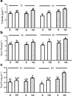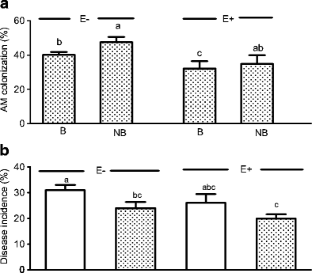 Shoot dry weight (a), root dry weight (b), and root length (c) of perennial ryegrass with (E+) and without (E−) grass endophyte and colonized by Claroideoglomus etunicatum (stippled bars) or non-mycorrhizal (open bars) at harvest. Mean ± SEM of four replicates. B = Bipolaris sorokiniana applied, NB = no B. sorokiniana. Bars topped by the same lower case letter do not differ significantly between treatments at P ≤ 0.05 by Tukey’s HSD. See Table 1 for ANOVA results (DOCX 152 kb)