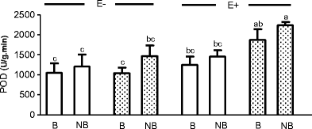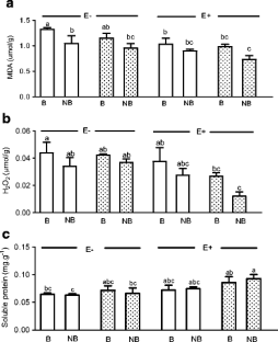 Superoxide dismutase (SOD) (a), catalase (CAT) (b), and polyphenol oxidase (PPO) (c) enzyme activity of perennial ryegrass with (E+) and without (E−) grass endophyte and colonized by Claroideoglomus etunicatum (stippled bars) or non-mycorrhizal (open bars) at harvest. Mean ± SEM of four replicates. B = Bipolaris sorokiniana applied, NB = no B. sorokiniana. Bars topped by the same lowercase letter do not differ significantly between treatments at P ≤ 0.05 by Tukey’s HSD. See Table 1 for ANOVA results (DOCX 128 kb)