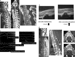 To investigation of the outcomes of indirect posterior decompression with corrective fusion for myelopathy associated with thoracic ossification of the longitudinal ligament, and prognostic factors. Conservative treatment for myelopathy associated with thoracic ossification of the longitudinal ligament (OPLL) is mostly ineffective, and treatment is necessary. However, many authors have reported poor surgical outcomes, and no standard surgical procedure has been established. We have been performing indirect spinal cord decompression by posterior laminectomy and simultaneous corrective fusion of the thoracic kyphosis. Twenty patients underwent indirect posterior decompression with corrective fusion, and were included in this study. The follow-up period was minimum 2 years and averaged 2 years and 9 months (2–5 years 6 months). Operative results were examined using JOA scoring system (full marks: 11 points) and Hirabayashi’s recovery rate, as excellent (100–75%), good (74–50%), fair (49–25%), unchanged (24–0%) and deteriorated (i.e., decrease in score less than 0%). Cases in which the spinal cord is floating from OPLL on intraoperative ultrasonography were defined as the floating (+) group, and those without floating as the floating (−) group. In addition, we used compound muscle action potentials (CMAP) as intraoperative spinal cord monitoring and the cases were divided into three groups: Group A, no change in potential; Group B, potential decreased, and Group C, potential improved. The mean pre- and postoperative JOA scores were 6.2 and 8.9 points, respectively, and the recovery rate was 56%. The outcome was rated excellent in three, good in eight, fair in six, unchanged in two, and deteriorated in one. The mean preoperative thoracic kyphosis measured 58°, and was corrected to 51° after surgery. On intraoperative ultrasonography, 12 cases were included in the floating (+) and 8 in the floating (−) groups; the recovery rates were 58 and 52%, respectively, showing no significant difference between the recovery rates of the two groups. Regarding intraoperative CMAP, the outcome was excellent in one, good in seven, fair in four, and unchanged in one in Group A; fair in one, unchanged in one, and deteriorated in one in Group B, and excellent in two and good in one in Group C. The recovery rates were 50, 48 and 68.3% in Groups A, B and C, respectively, showing that the postoperative outcome was significantly poorer in Group B. Although indirect posterior decompression with corrective fusion using instruments obtained satisfactory outcomes, not all cases achieved good outcomes using this procedure. We consider that additional application of anterior decompressive fusion is preferable when improvement of symptoms occurs not satisfactory after indirect posterior decompression with corrective fusion using instruments. Intraoperative spinal cord monitoring of CMAP demonstrated that the spinal cord was already impaired during the laminectomy via the posterior approach. Concomitant intraoperative monitoring of CMAP to avoid impairment of the vulnerable spinal cord and corrective posterior spinal fusion with indirect spinal cord decompression is recommendable as a method capable of preventing postoperative neurological aggravation.