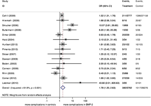 We identified 26 studies reporting on a total of 184,324 patients (28,815 experimental, 155,509 controls) with a mean age of 51.1 ± 1.8 years. There was a significantly higher risk of general complications with rhBMP-2 compared to iliac crest bone graft (ICBG) with an odds ratio (OR) of 1.78 (95 %CI 1.20–2.63), (p = 0.004). The odds ratio for HO was 5.57 (95 %CI 1.90–16.36), (p = 0.002), for retrograde ejaculation 3.31 (95 %CI 1.20–9.09), (p = 0.020), and for cervical swelling 4.72 (95 %CI 1.42–15.67), (p = 0.011), all significantly higher in the rhBMP-2 group. The pooled odds ratio for new onset of tumor was 1.35 (95 %CI 0.93–1.96), which represents no statistically significant difference between the groups (p = 0.111).