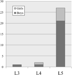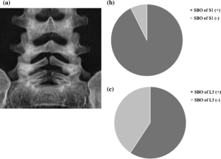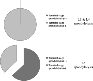 Among the 30 patients, 27 (21 boys, 6 girls) had L5 spondylolysis (90.0 %). Only 2 patients had no history of athletic activity at the first consultation. All patients, except for 2 whose diagnosis was incidental, complained of low back pain. In the 27 patients with L5 spondylolysis, 17 (63.0 %) had terminal-stage fracture and 25 (92.6 %) had spina bifida occulta (SBO) involving the S1 lamina. Sixteen of the 27 (59.3 %) had SBO involving the affected lamina (L5) and S1 lamina. In contrast, the 3 patients with L3 or L4 spondylolysis had no evidence of SBO. With respect to skeletal age, 23 of the 27 L5 spondylolysis patients (85.2 %) were in the cartilaginous stage while the remaining 4 patients were in the apophyseal stage.