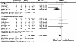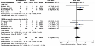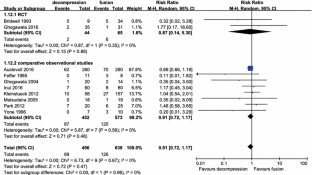A search of the literature was conducted on PubMed/MEDLINE, EMBASE, and the Cochrane Collaboration Library. Relevant studies comparing decompression plus fusion and decompression alone were selected according to eligibility criteria. Predefined endpoints were extracted and meta-analyzed from the identified studies.