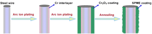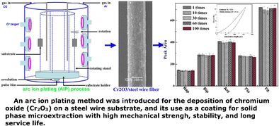 An arc ion plating method was introduced for the deposition of chromium oxide (Cr2O3) on a steel wire substrate, and its use as a coating for solid phase microextraction with high mechanical strength, stability, and long operational lifetime.