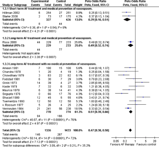 Using a pre-specified search strategy, 17 relevant studies involving a total of 2,872 patients with SAH at baseline, from which data of 1,380 patients having received AF, were included in a meta-analysis. Pooled odds ratios of the impact of AF on functional outcomes, rebleeding, and cerebral infarction were calculated. Short-term use of AF (72 h or less) associated with medical prevention of ischemic deficit seems to yield better results on functional outcome than long-term use of AF, especially if not associated with a medical prevention of ischemic deficit. The risk of cerebral infarction is not increased by the short-term use of AF and the risk of rebleeding is decreased independently of the length of AF use.