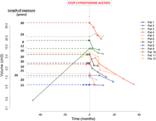 Since 2010, all patients referred to our clinic for a suspicion of meningioma were questioned specifically about exogenous sex hormone intake and more specifically about CA intake. Twelve patients harboring one or multiple meningiomas and treated with CA were identified. CA was stopped in all cases. Tumor volumes and diameters were measured on serial MRIs and compared to the last MRI before CA withdrawal.