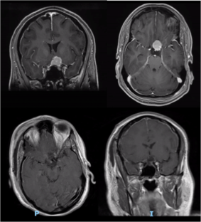 Contralateral lateral supraorbital approach was performed, and complete tumor resection was achieved without any injury to the optic nerve.