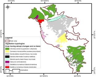 Abrupt changes are referred to as fundamental changes in the mean of a system’s variable or its variability which occur in a short term. Abrupt changes in climatic factors may, especially in arid lands, lead to the transition of plant communities as their response to such disturbing elements. However, such a relationship (between factor and response) which helps develop more sustainable policies for ecosystem management has so far been underresearched. This study, therefore, set out to identify the abrupt changes occurred in plant communities and their relationship with the sudden variations of climatic factors in Sirjan desert and semi-desert region, located in Kerman, Iran, from 2000 to 2019. To this end, first, the meteorological data were collected from the region’s representative station (Sirjan synoptic Station) and the plant communities’ maps were extracted based on field operations. Then, the Moderate Resolution Imaging Spectroradiometer’s (MODIS) monthly data from 2000 to 2019 were used to extract Normalized Difference Vegetation Index (NDVI) and the Enhanced Vegetation Index (EVI) whose maps were limited to the community’s maps under zonal statistic survey, using Arc-GIS 10.4.1 package. Finally, the sequential Mann–Kendall (SMK) test was administered to identify the abrupt changes in climatic factors and those of each plant communities. The abrupt changes in yearly total precipitation (YTP) in 2002, 2008, 2014, and 2018 occurred concurrently with the responses made by plant communities including the Artemisia sieberi-Zygophyllum atriplicoides, Ephedra intermedia-Cousinia multilobe. In this regard, the cumulative effect of the abrupt change of the winter precipitation (WP) factor in 2002 and 2014 and the abrupt increase of the average yearly temperature (YAT) factor in 2018 was highly effective in the intensification of the stimulating role of total yearly precipitation (YTP) in making the plant communities respond as a result. Despite the concurrent responses observed in the vast majority of plant communities, the reason behind some of their responses in 2006, 2011, 2013, and 2016 remained unknown, requiring more investigations in terms of other environmental variables.