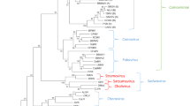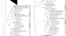 The conserved domains between the “CG” motif of the 3C proteinase and the “GDD” motif of the polymerase (Pro–Pol region) have been used to determine the relationships among picornavirales [23]. Phylogenetic studies using the Pro–Pol region reveal that all plant picornavirales group into a single branch when compared to other members of the order Picornavirales (see multiple sequence alignment generated with the ClustalX program [39] in Supplementary Fig. 1 and dendogram in Fig. 2). Although the level of diversity within this branch is high, it is in the same range as that currently accepted for the family Picornaviridae [23]. Within the plant picornavirales branch, several lineages are formed that generally represent the various genera within the proposed family Secoviridae (Fig. 2).